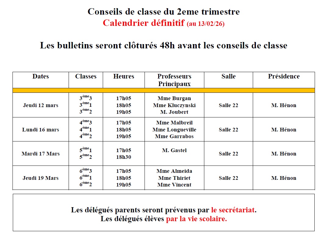 Vous trouverez ci-dessous la planification des conseils de classe du 2e trimestre 2025-2026